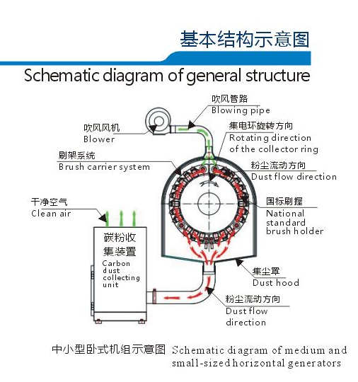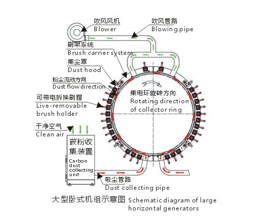 Brush Carrier and CarbonDust Collector for Horizontal Hy drogenerator Preductln troducticn To eliminate hardcarbon dust collection in horizontal hy drogenerators,our company hasresearchedanddeveloped a special carbon dust collector for horizontal generating units whichhas been patented (patent No:ZL2009 2012 8625.0)Thecarbon cust collector comprises ofa bulb-inside collector ring, a collection hood, ablowing system, a pipeline system, a carbon dust collecting system and an electric control system. Three Major Functions 1.Effective carbon dust collection 2.Effective cooling of the collector ring 3.Observation andreplacement of carbon brush without stopping the machine For Customization, parameters shall be specified 1.Unit capacity,excitation current, voltage 2.Collector ring diameter,external dimension ofthe upper frame 3.Brush support carrier connection andinterface sizes