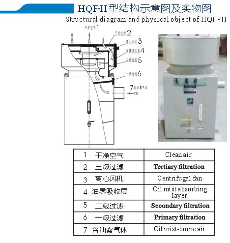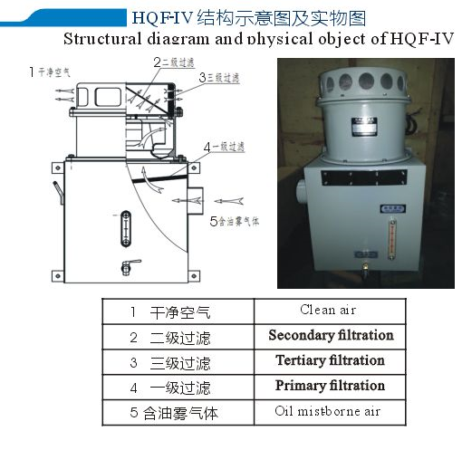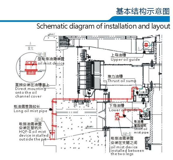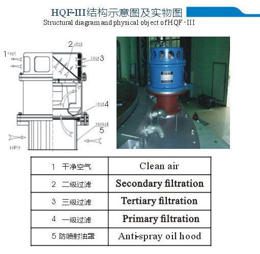 Oil Mist Collector ProductIntroduction Oilmist overflow during operation of generator bearings not only causes pollution tothe environment but also reduces the insulat ing performance ofthe generator stators androtors, whichmay endanger the safe operation of the generators andresult in laboriousmainten ance andrepair.To eliminate the general presence of heavy oilmist in generators,our company hasresearched and developed:- an oil mist collector that has been patented(patentNo.:ZL 201110189156.5) Features 1.HQF-II features large power,suitability for installation out of wind tunnels,easyinstallation andmainten ance; 2.As HQF-Ill is small, it can be directly mounted onto the oil channel cover without any pipefor connection; 3.HQF-IV can be mounted on the thrust oil sump gusset plate,with only a short pipe needed; 4.HJD-l can be installed andused for special needs without the needfor replacing the filterelem ent. For Customization,parameters shall be specified 1.Openinglocation and dimension (interface) for the oil channel cover 2.Installation mode ofthe oil mist collector 3.Oil channel capacity 4.Layout plan of the upper andlower frames of the generator